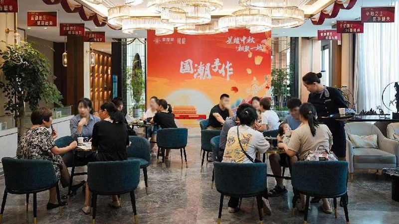 橫店星耀城項目舉辦了國風古韻游園派對,精心準備了國潮月餅、水扇、竹編畫等娛樂手作項目,并提供極具東方藝術特色的故宮文創、茅臺周邊等紀念品供客戶選取留念。現場洋溢著歡樂的節日氣氛。
