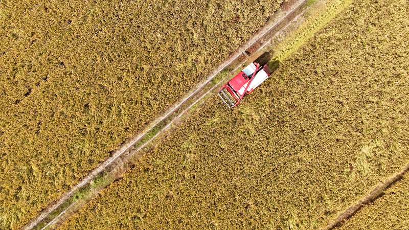 糯稻基地里稻浪翻滾,滿目金黃,田間地頭彌漫著稻谷的清香?!昂眉Z釀好酒,好酒是種出來的,浙農-會稽山糯稻基地開鐮節正式啟動!”隨著領導嘉賓鏗鏘的號令,現場一字排開的多臺收割機發動引擎,在金色的稻浪中向前運作收割。稻田上空還有2架小型無人機拉著寫有“好酒是種出來的”字樣的橫幅來回飛翔。